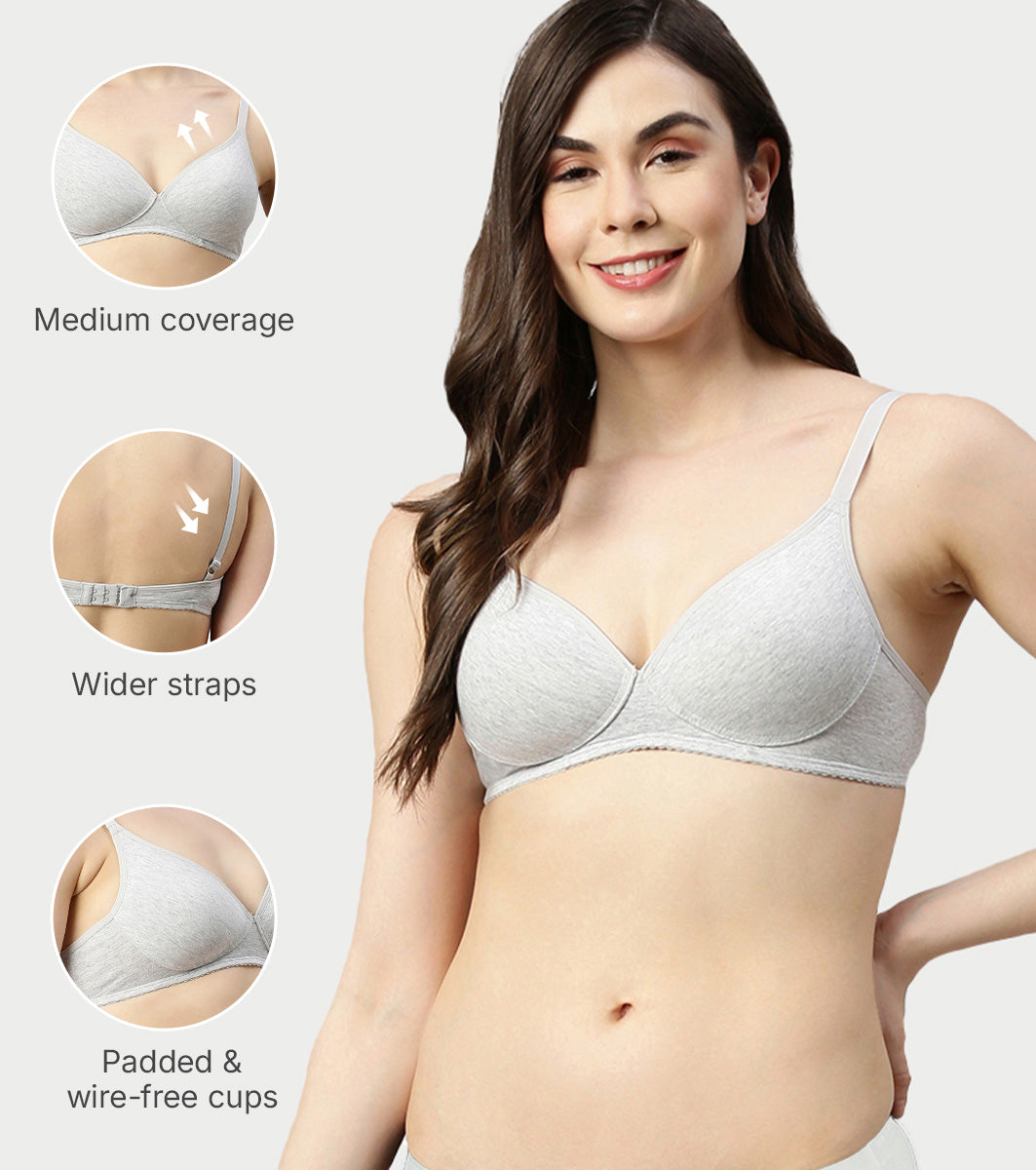 Enamor Supima Cotton Women's Plunge Lift Everyday T-Shirt Bra - Extra Comfort, Padded, Wirefree, Medium Coverage - A039 (Greymelange)
