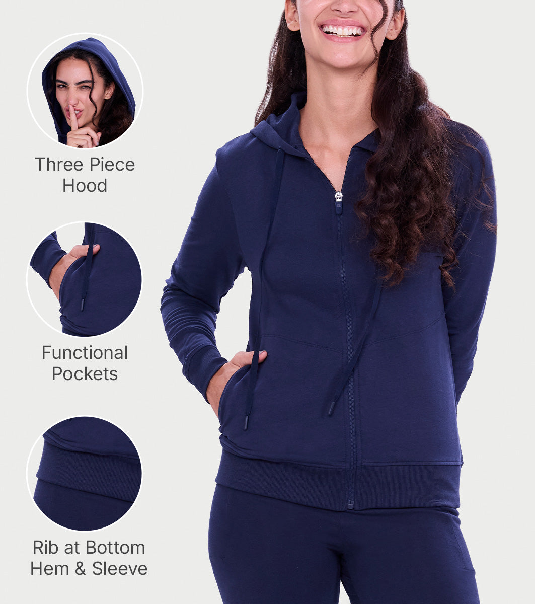 Easy movement & adjustability with raglan sleeves and drawstring hood.
