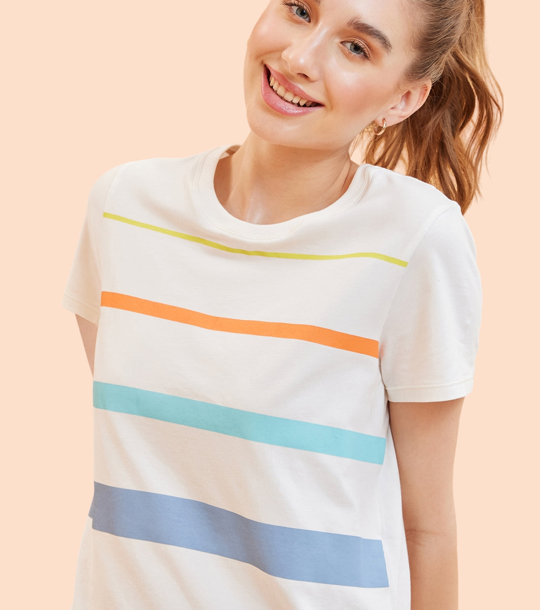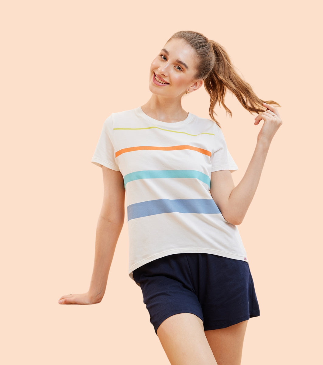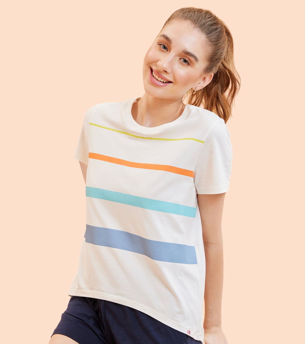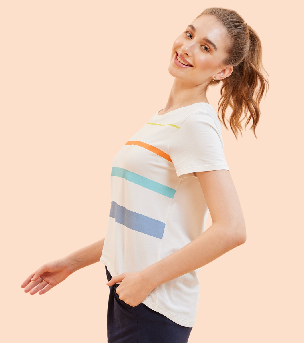 Enamor E3S5 High Low Tee Stripe - Short Sleeve Crew Neck Stretch Cotton Tee with Stylish Stripes