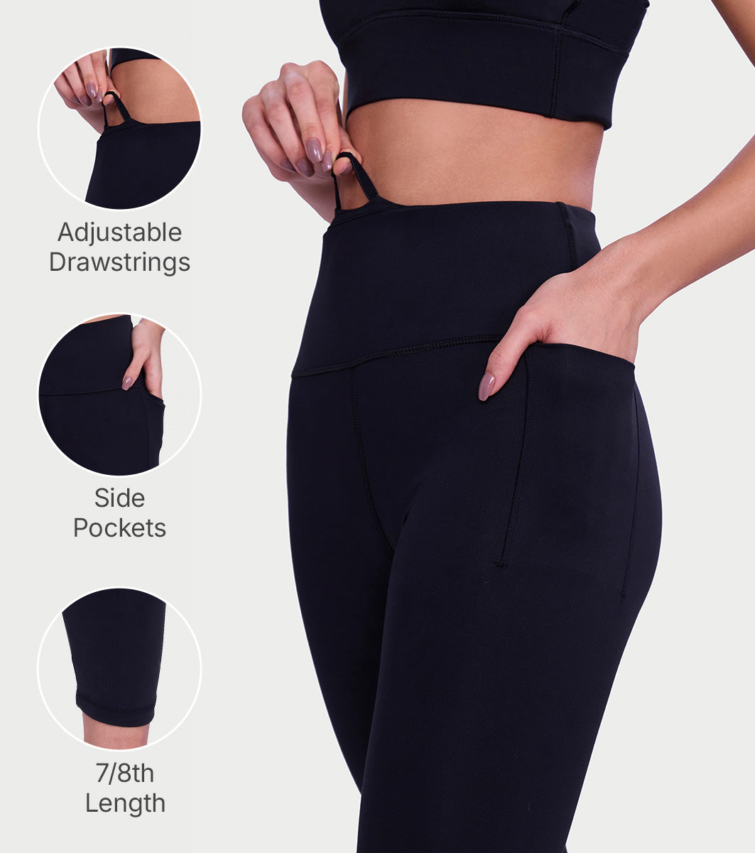 Hugged Fit – High-rise waistband with adjustable drawstrings, medium support, and 7/8 length for a flattering, stay-put silhouette.