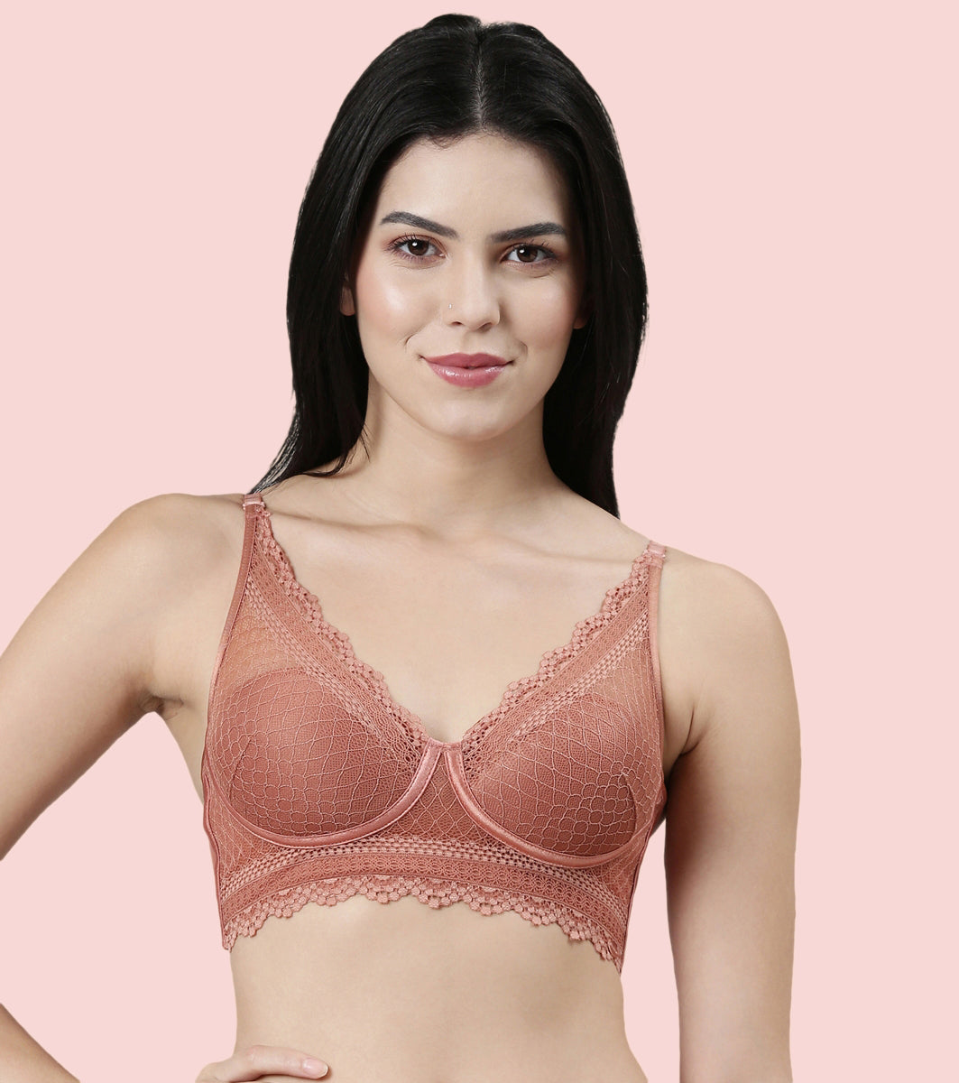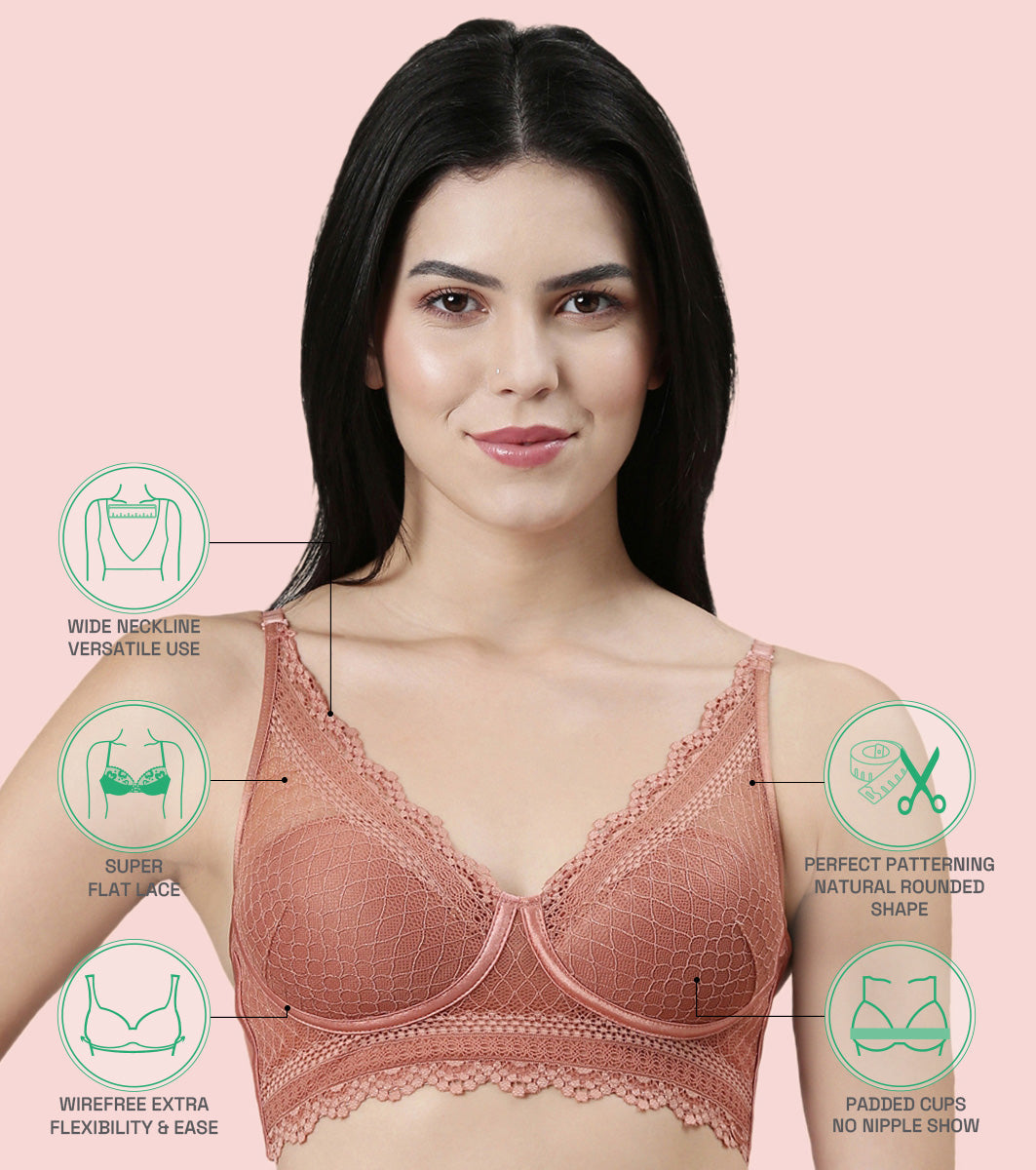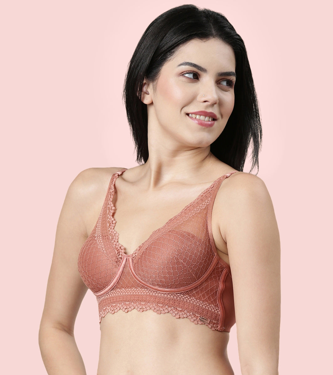 Enamor Innovations Pure Ease, Cloudsoft cup ,Women's Longline Comfort Lace Plunge Bra - No-Pinch, No-Dig, Padded, Wirefree, High Coverage - F125 (Cedar Wood)