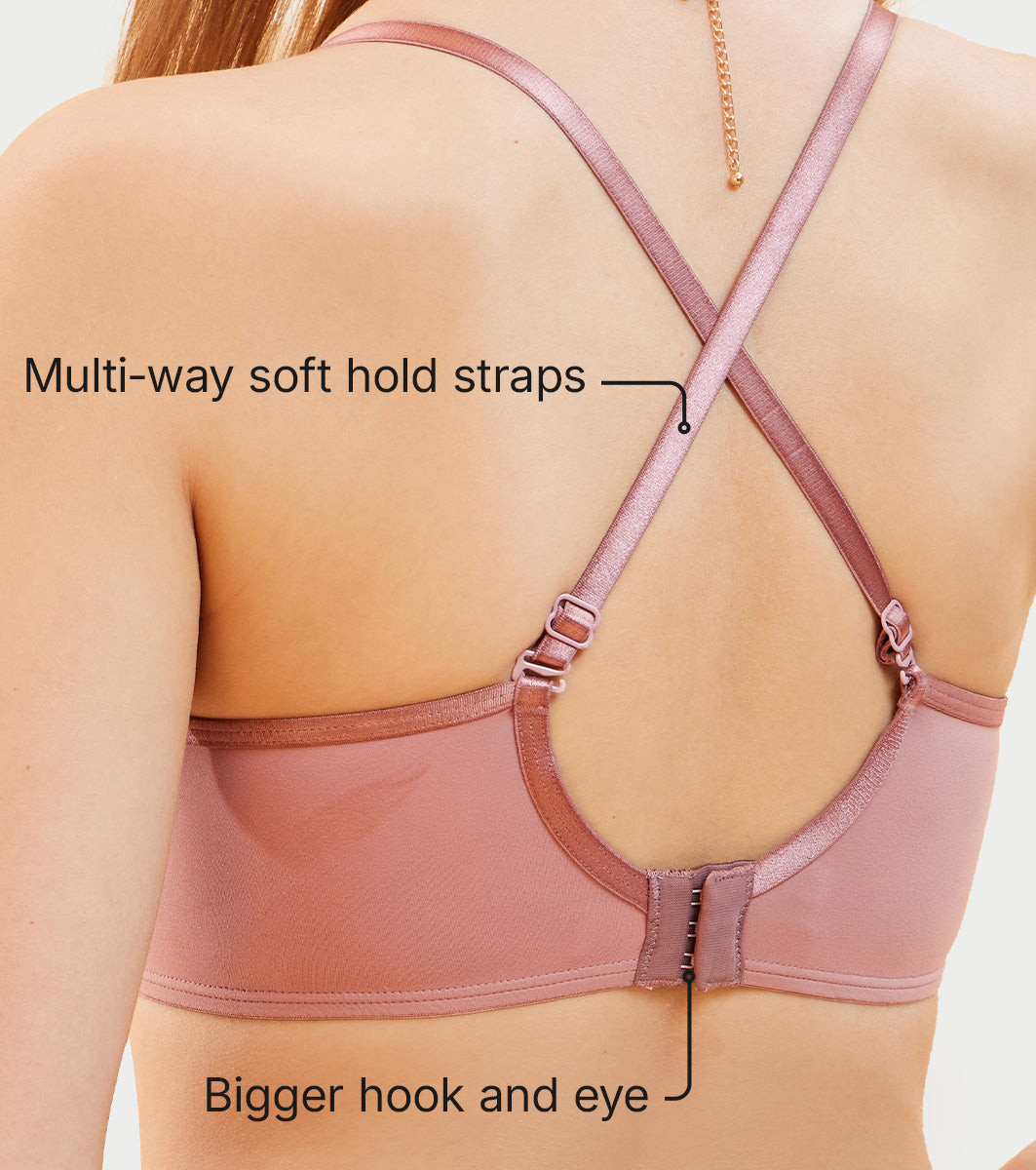 - Wider straps and hook and eye on bigger sizes for better comfort and support