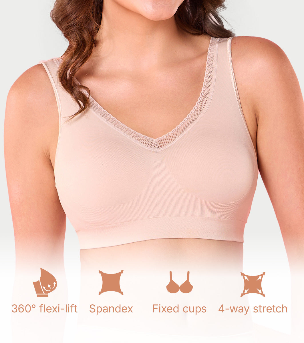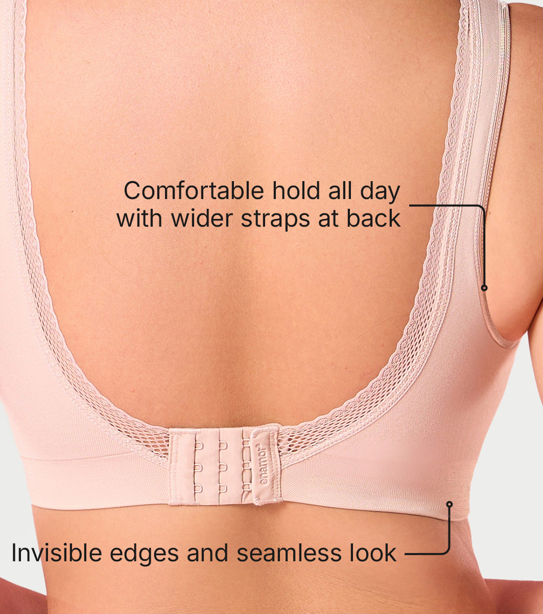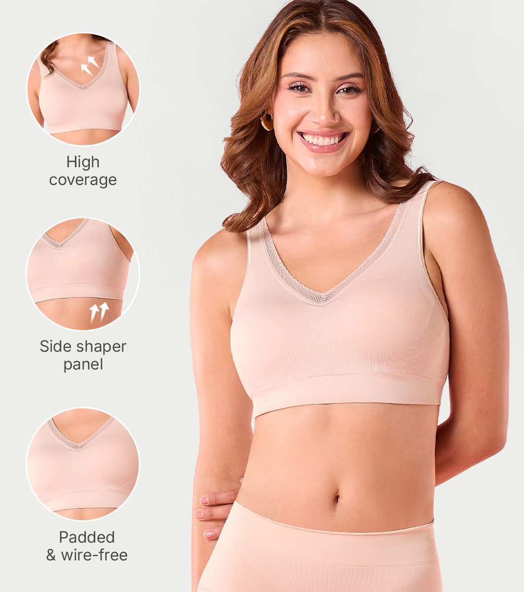 - Ultra-smooth no-pinch bra with seamless engineered knitting provides 360 degree flexible support.