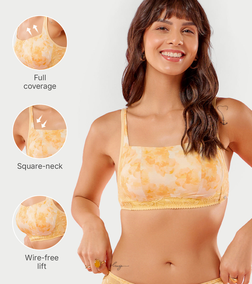 - Square-neck floral printed bustier padded bra featuring a stylish and modern design. Crafted for a trendy look, this bra offers a comfortable wire-free fit with soft padding for gentle support and shaping. The bustier-style silhouette enhances the overall appeal, while the delicate floral print adds a touch of femininity. Perfect for both everyday wear and fashion-forward styling.