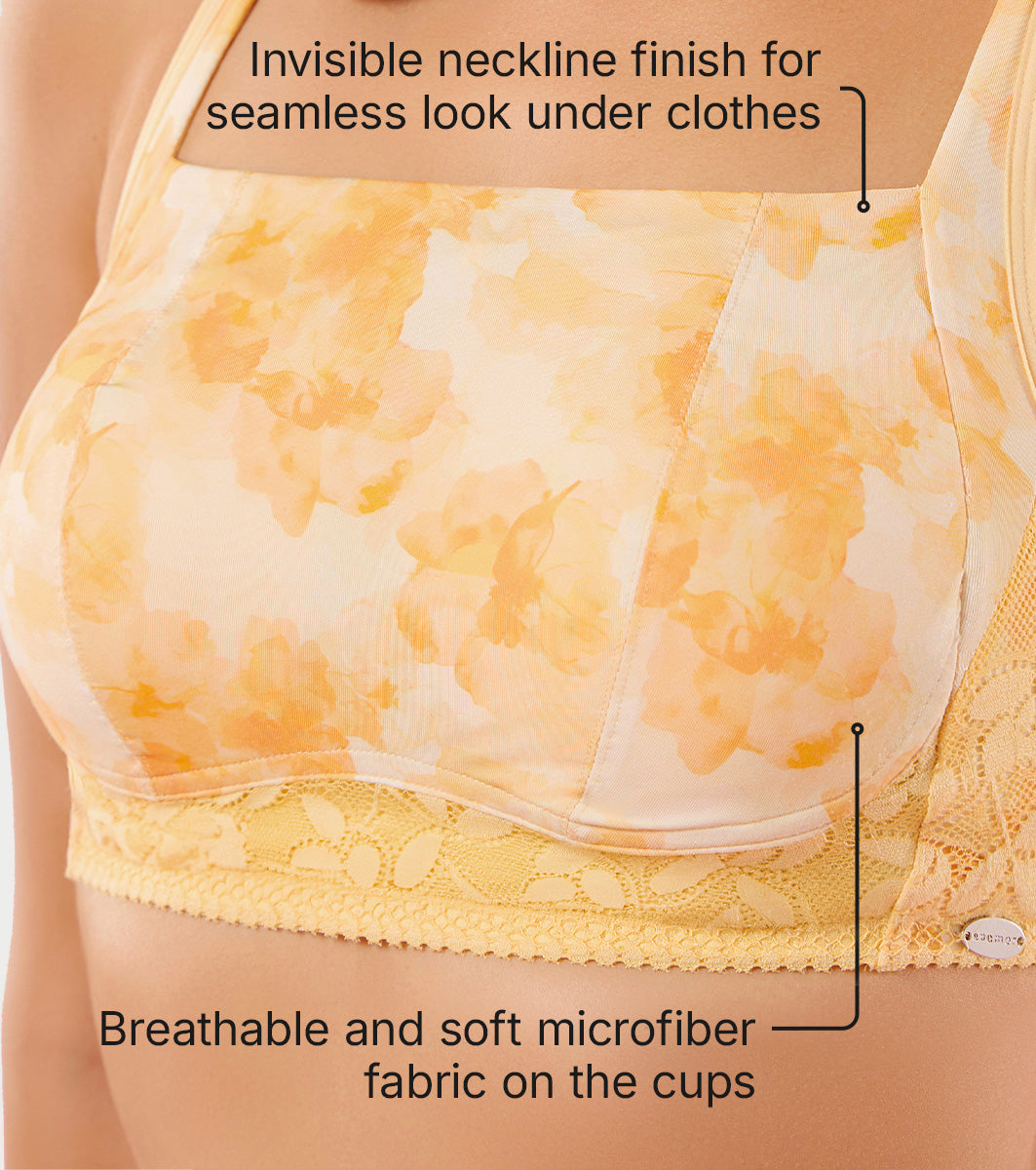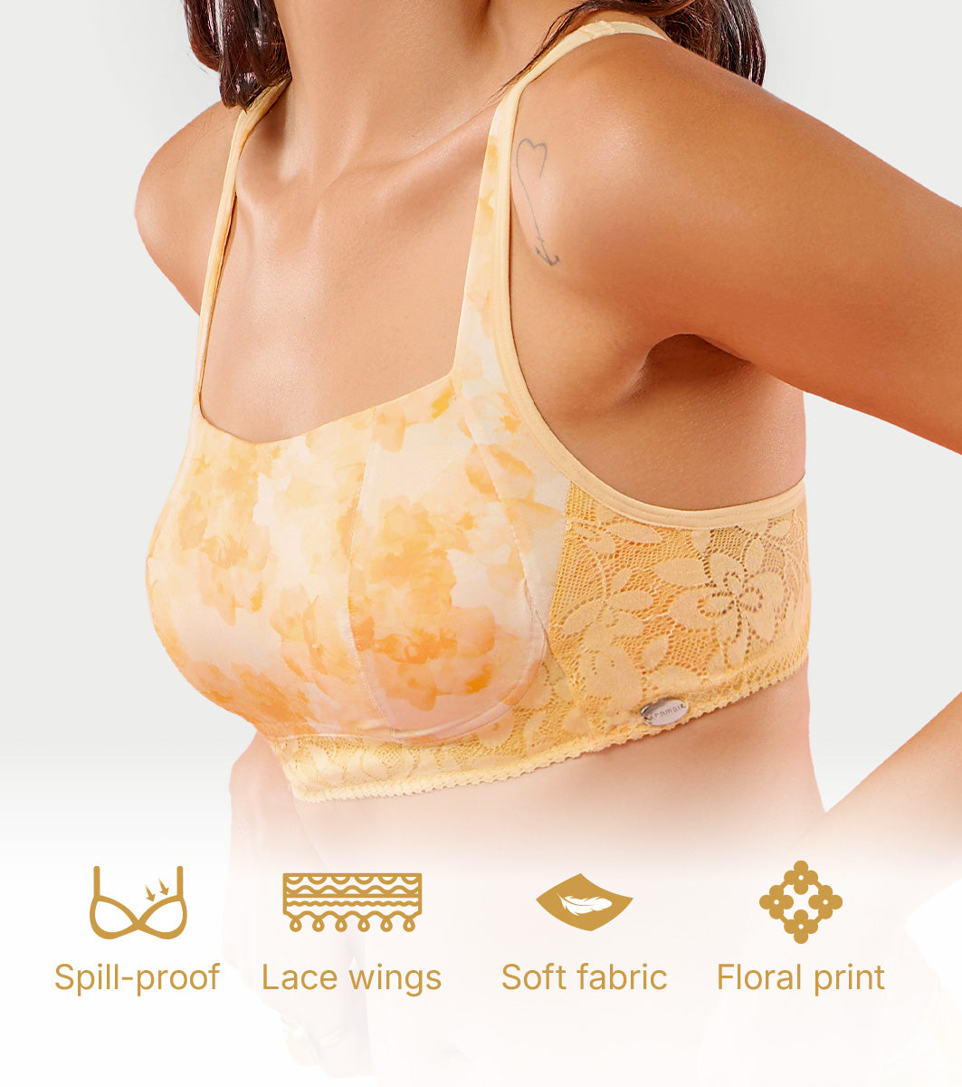 - Soft microfiber fabric on cups with a summery print and cotton-feel lace wings, perfect for holidays.