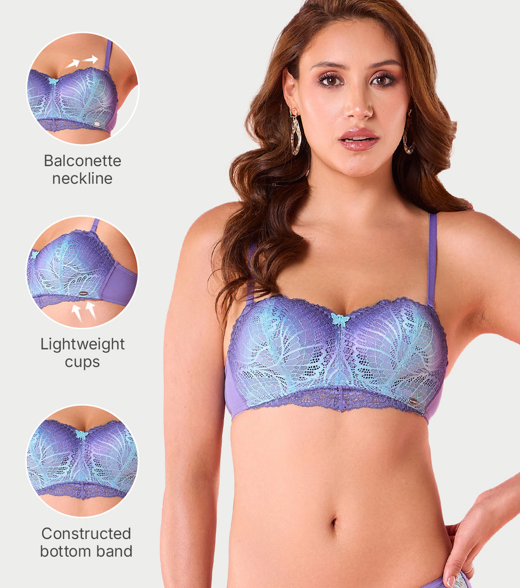 Elevate your elegance with our Lace Balconette Padded Bra. Designed for a naturally lifted silhouette, this non-wired style offers gentle support with soft padding for a flattering shape. The intricate lace detailing on the cups and bottom adds a romantic touch, while the smooth microfibre back ensures all-day comfort. Perfect for a chic and feminine look.