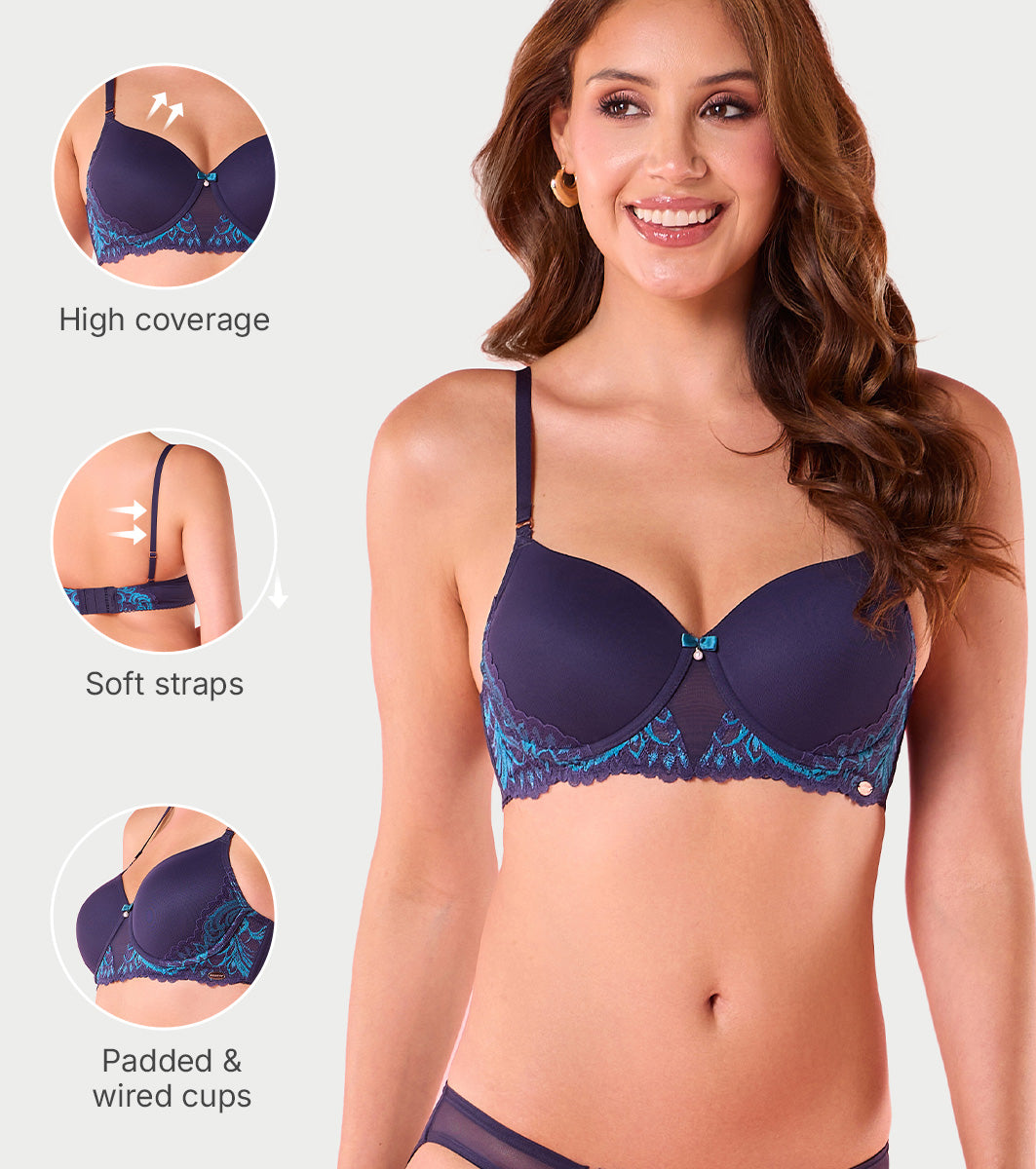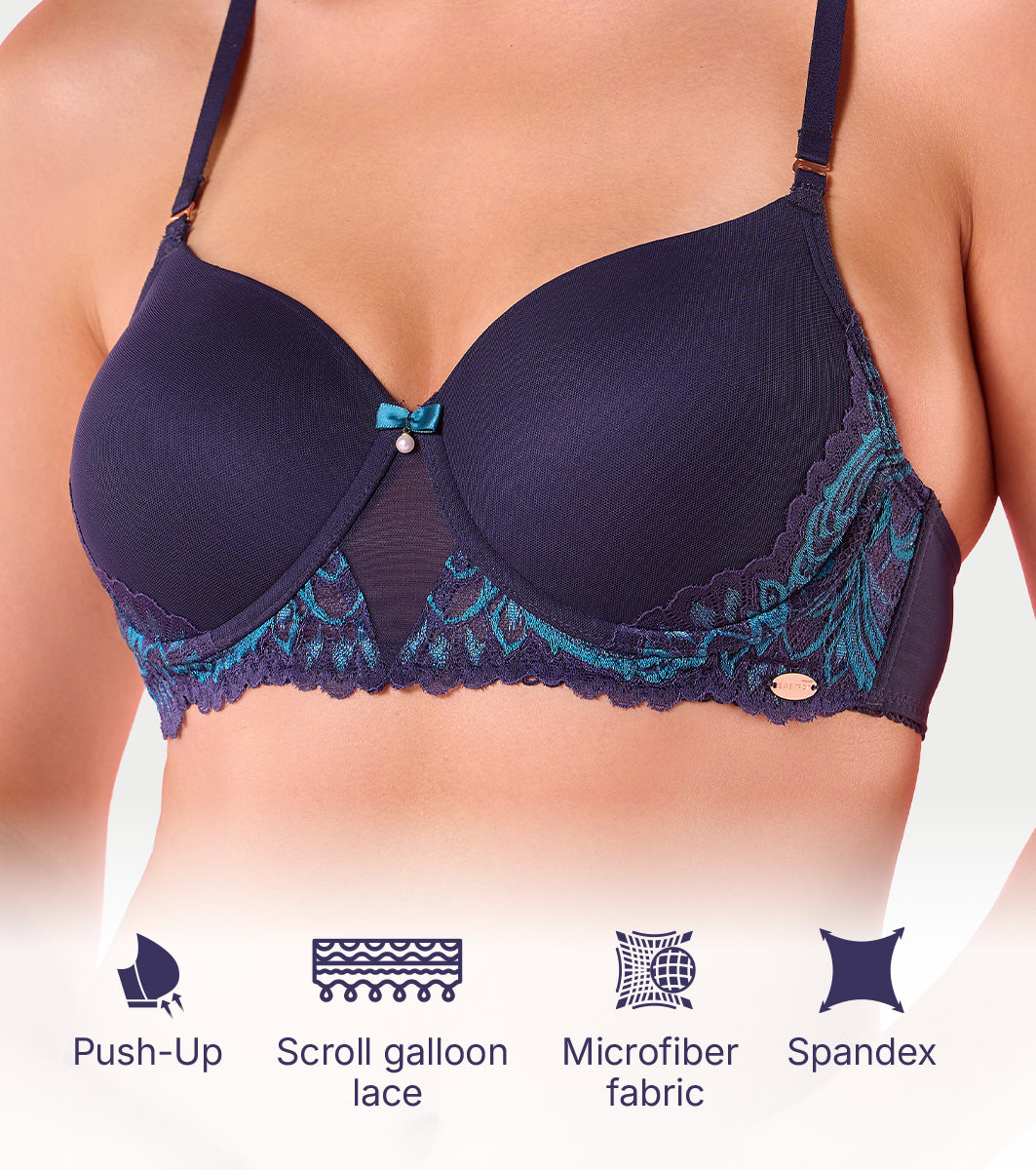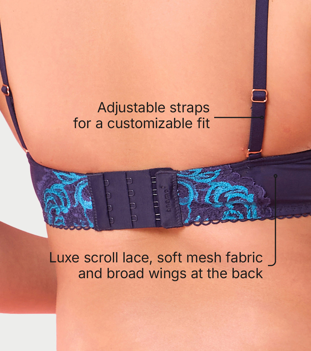 - Extra comfort and support with crush-proof cups, luxe scroll lace, soft mesh fabric back, and broad wings.