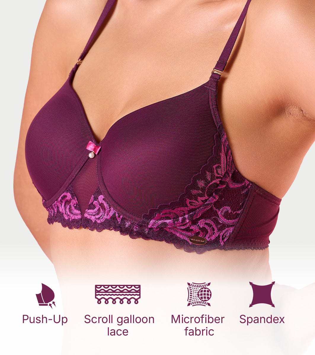 Redefine sophistication with our Elegant Scroll Lace Padded Bra. Featuring smooth, wired cups for a clean and seamless look, this style offers enhanced support and a flattering shape. The intricate scroll lace at the bottom adds a touch of elegance, while the delicate tulle back creates a lightweight, airy feel. Perfect for a blend of comfort and refined beauty.