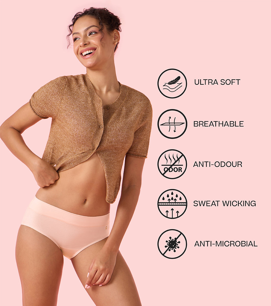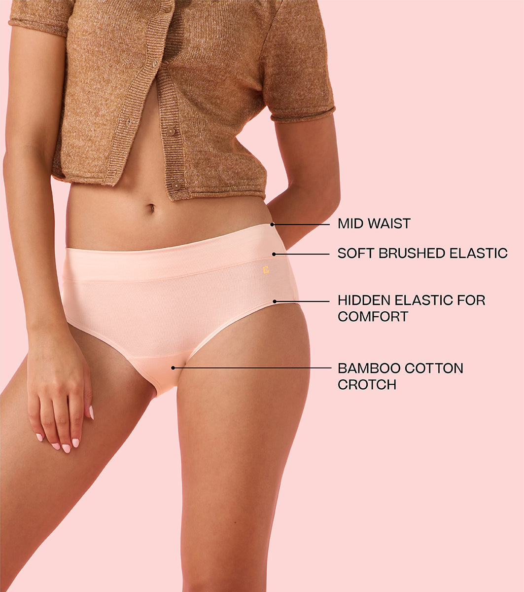 Enamor Innovations Bamboo Bliss, Anti Rash, All Day Comfort, Mid Waist Brief Panty for Women - Super Soft, Naturally Absorbent, Antimicrobial with Stain release, Inner Elastic, Full Coverage- IP01 (Pearl Blush)