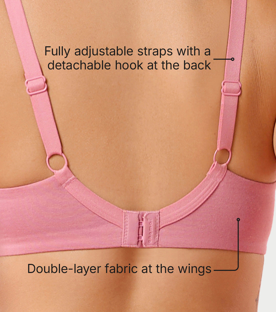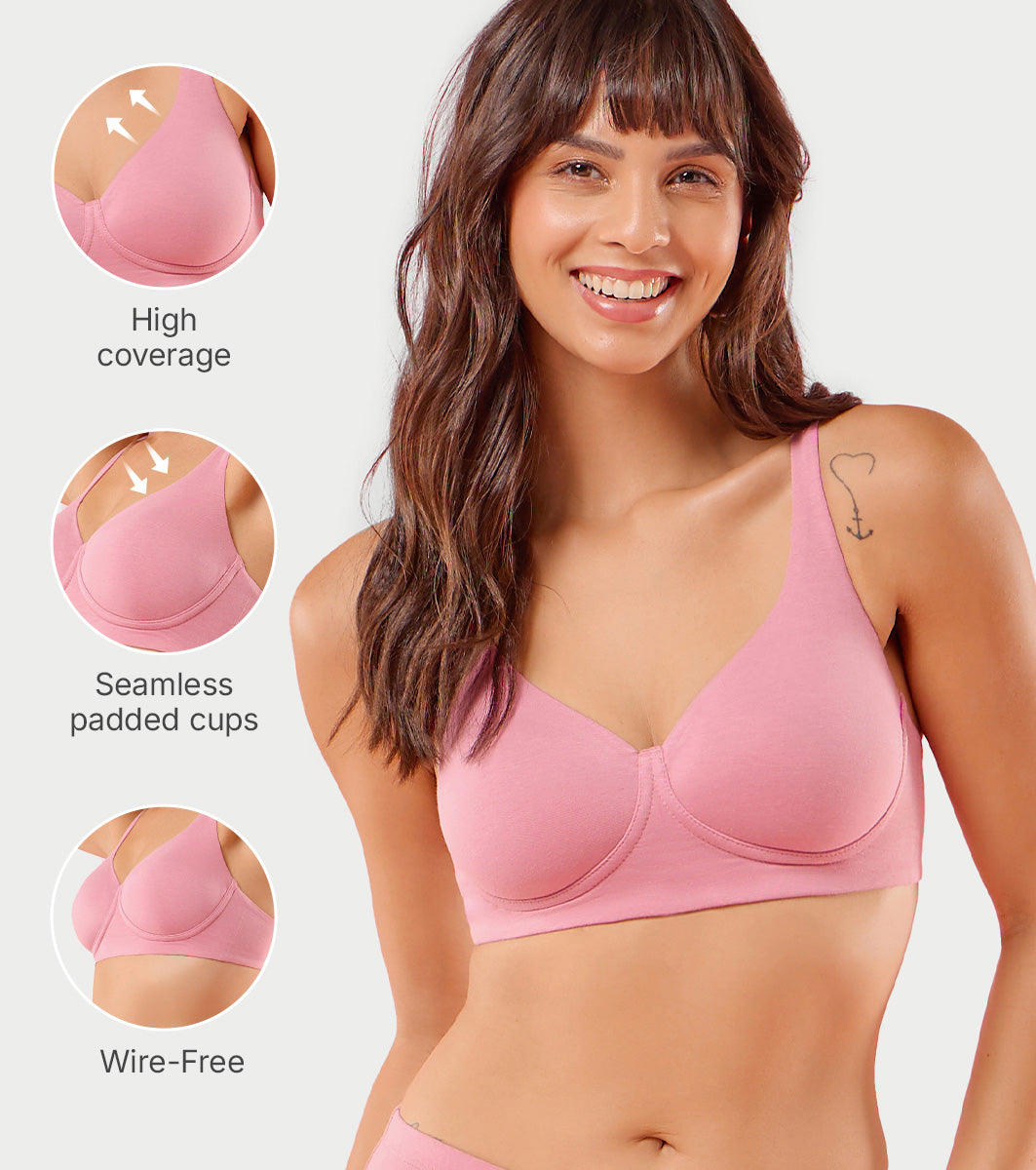 Experience ultimate comfort with this padded, non-wired bamboo bra, designed for a soft and supportive feel. Featuring high coverage and cloud-soft cups, it ensures a gentle fit while providing a natural shape. The double-layer wings with hidden elastics offer enhanced support and a smooth finish, making it perfect for all-day wear. Crafted from breathable bamboo fabric, this bra is ultra-soft, moisture-wicking, and ideal for sensitive skin. A must-have for effortless comfort and everyday luxury.