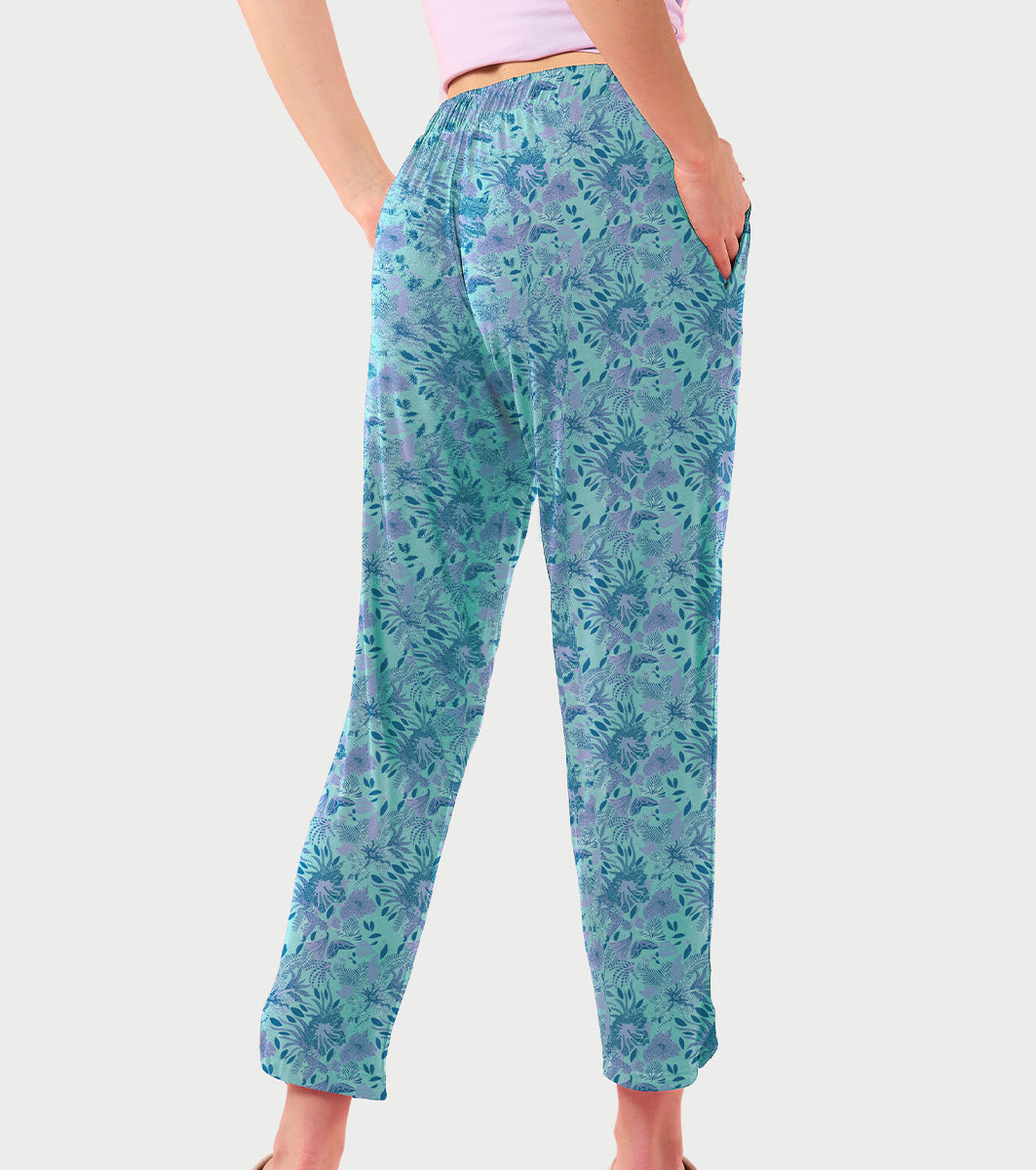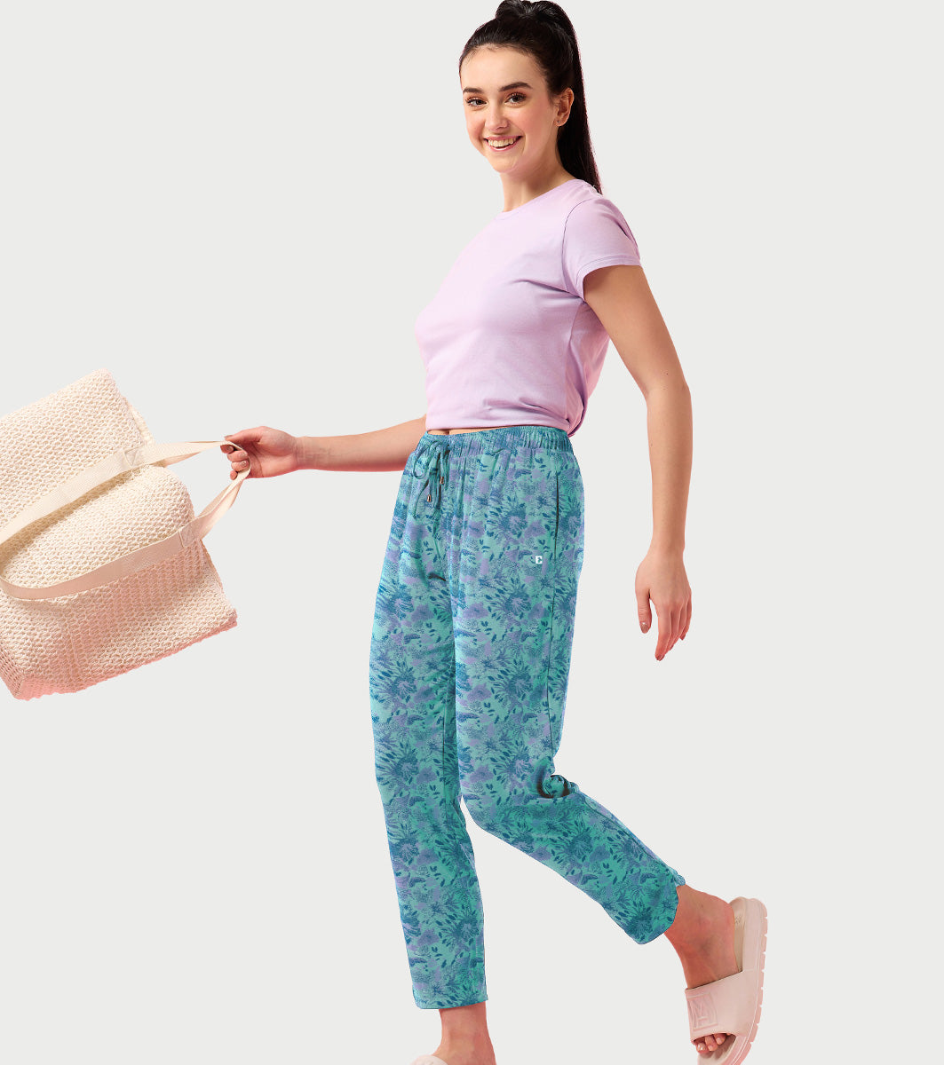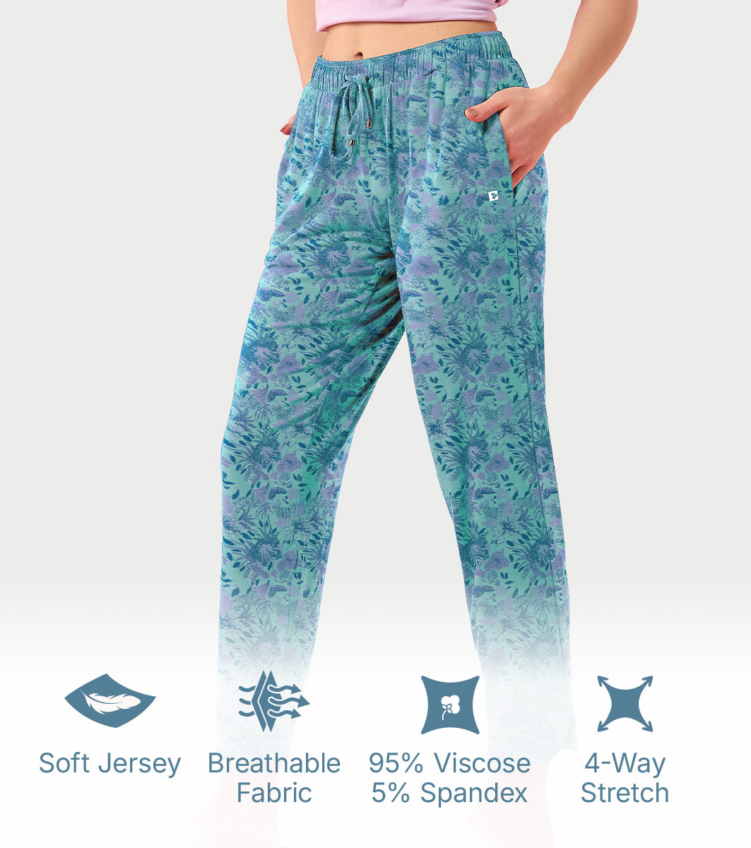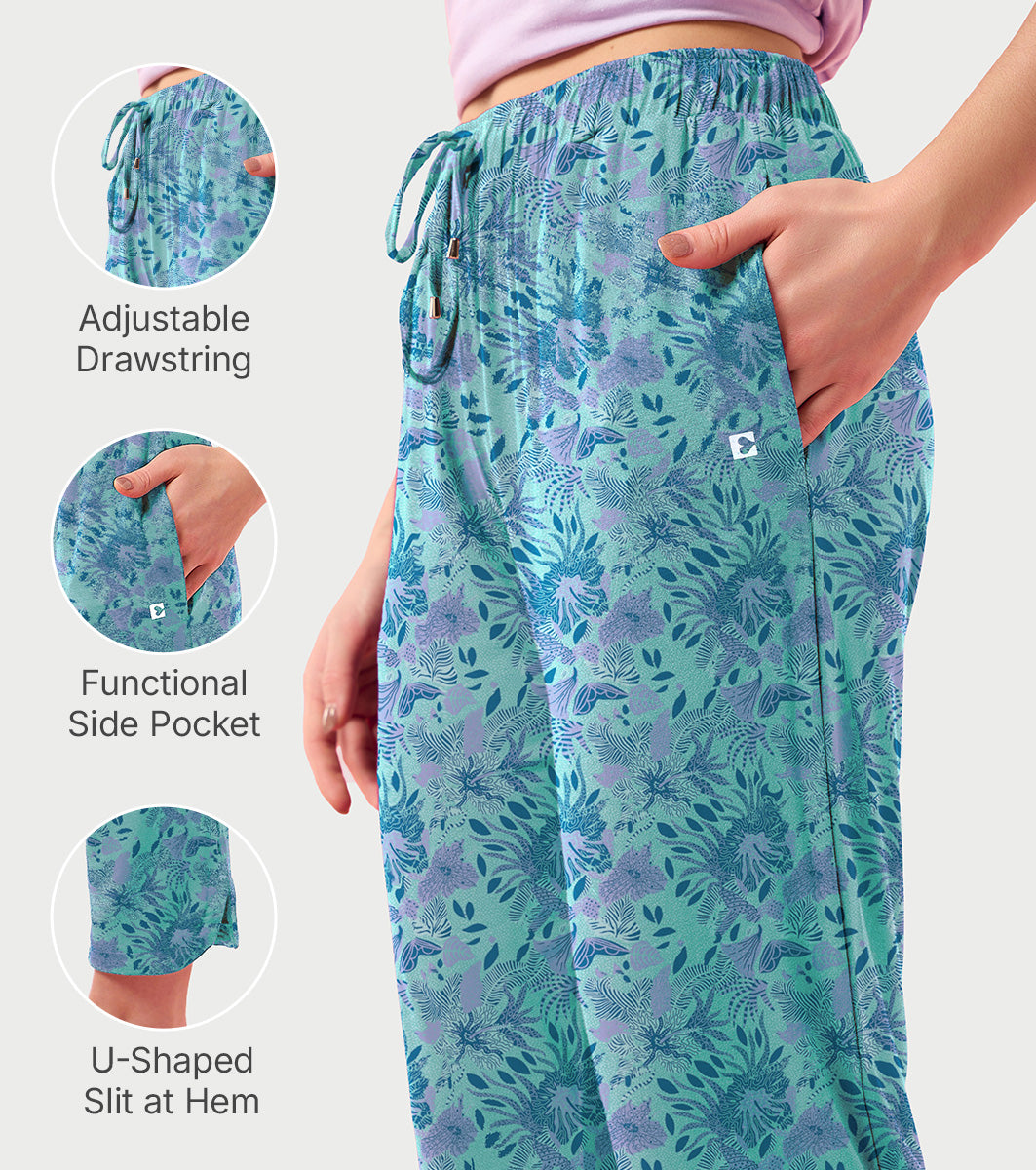 Enamor Mid Rise 7/8th length Drawstring Closure Shop In Pants for Women - Relaxed Fit, Soft & drapey 4-way stretch - E048 (Iceberg Green Sea Plants Print)