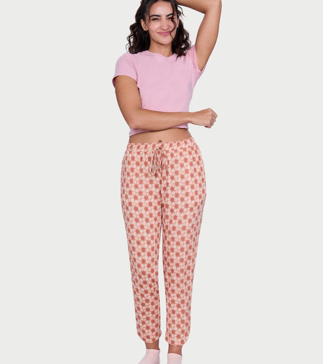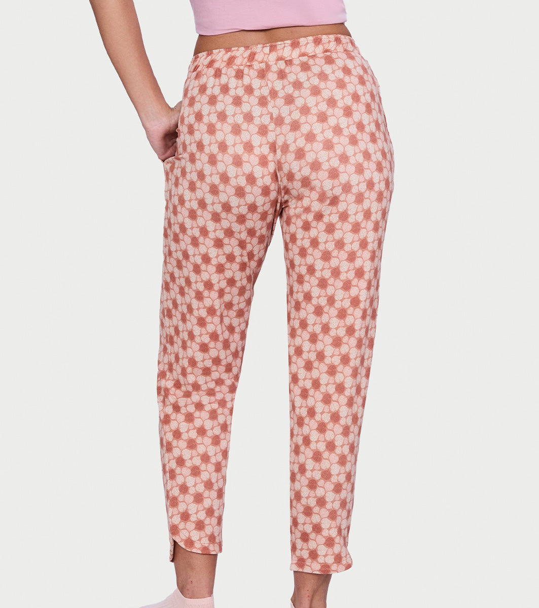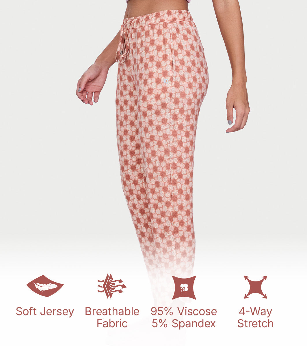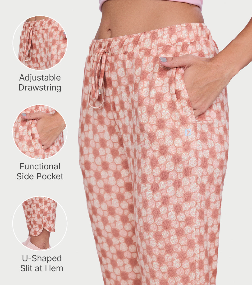 Enamor Mid Rise 7/8th length Drawstring Closure Shop In Pants for Women - Relaxed Fit, Soft & drapey 4-way stretch - E048 (Mocha Mousse Leaf Cell Print)