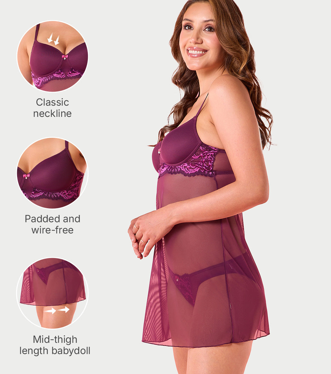 Step into effortless elegance with our Tulle & Lace Padded Babydoll. This non-wired style features soft padding for gentle shaping, while airy tulle fabric on the cups and bottom creates a dreamy, lightweight feel. The delicate scroll lace at the basque adds a touch of romance, making it the perfect blend of comfort and allure.