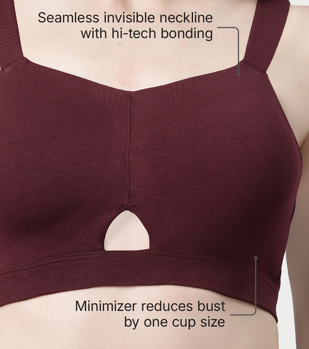 Enamor Innovations Cloudsoft Invisi Bonded Neck Women's Everyday Cotton Minimizer Bra - Padded, Wirefree, Full Coverage - A064 (Available in Plus Sizes) (Grape Wine)