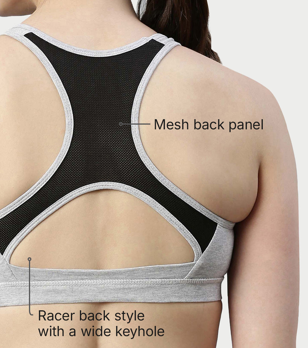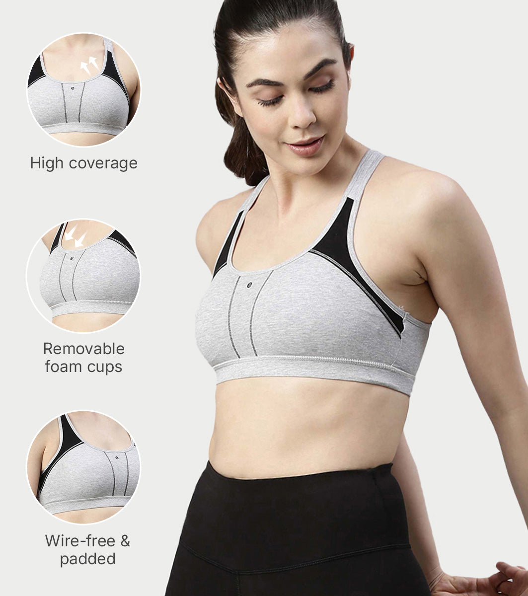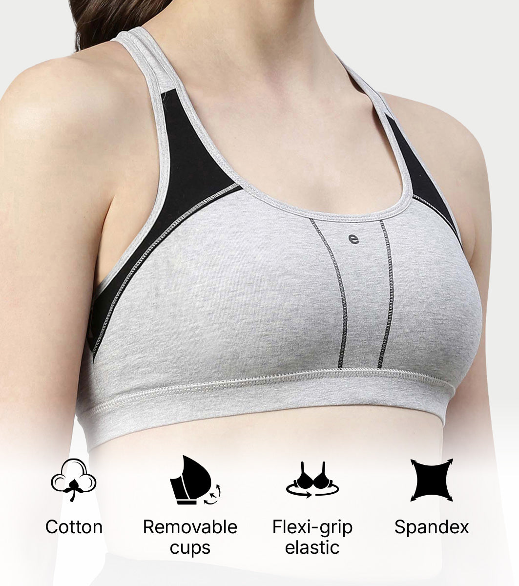 Enamor Medium Impact, Side Panel Shaping, Racer Back Women's Cotton Sports Bra - Padding with Removable Cups, Wirefree, High Coverage - SB08 (Greymelange)