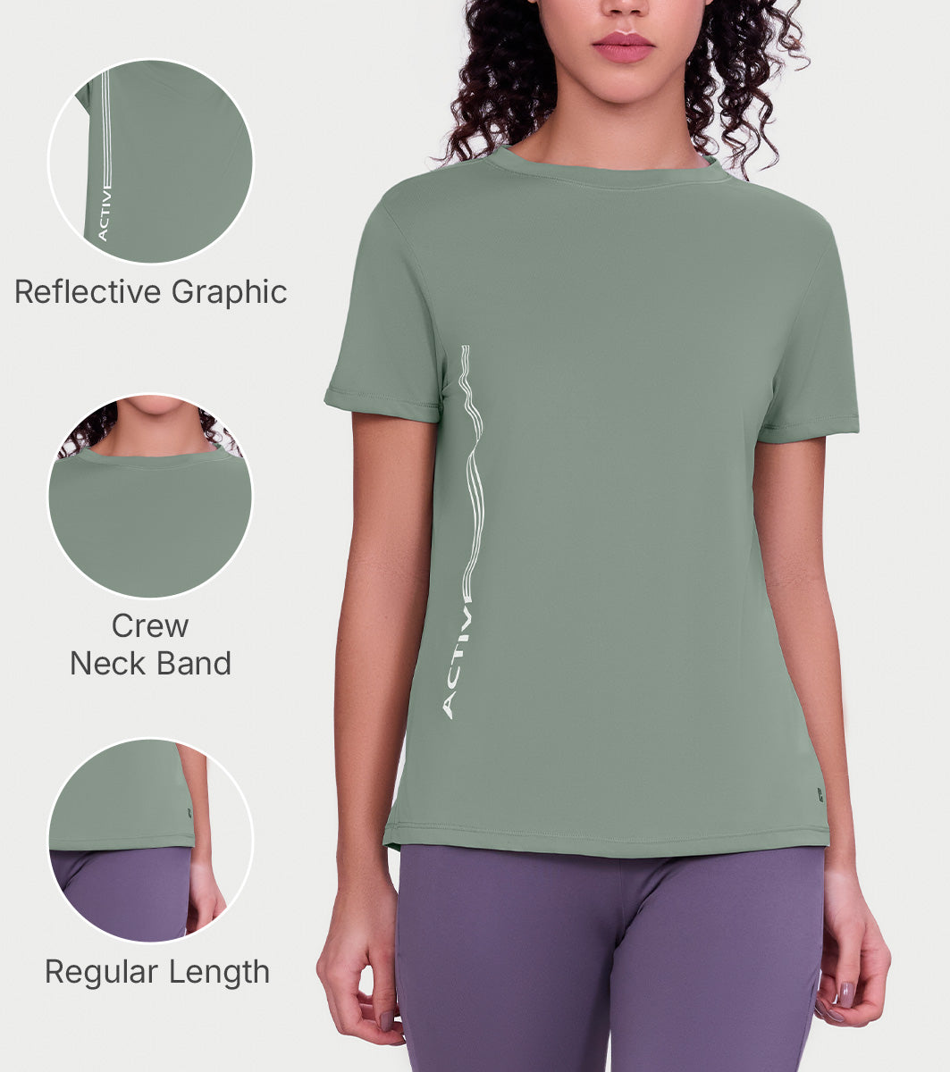 Designed for your daily workout routine. Crew neck & short sleeve for your comfort with reflective graphic detail. Stay Active Stay fabulous!