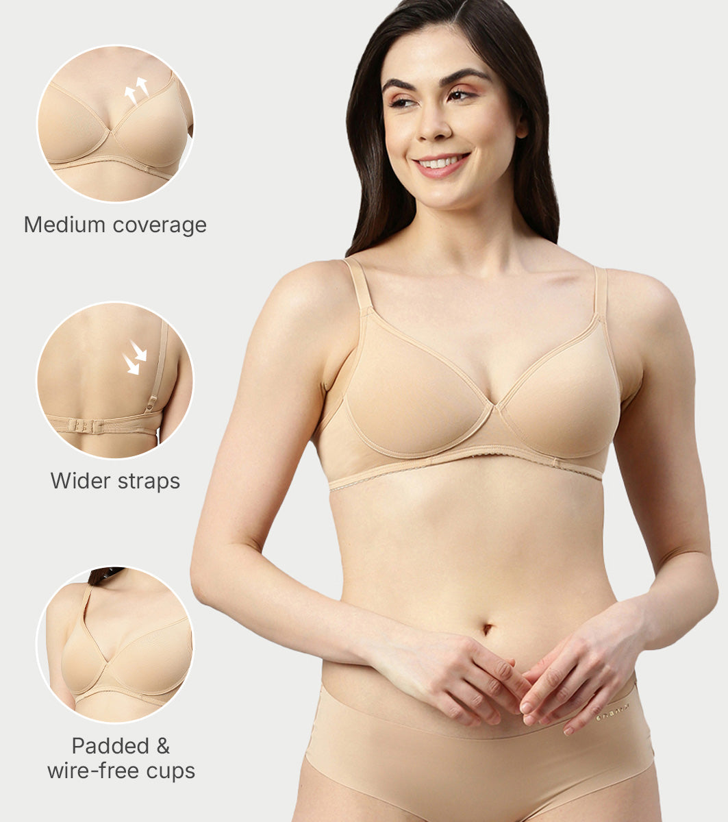 Enamor Supima Cotton Women's Plunge Lift Everyday T-Shirt Bra - Extra Comfort, Padded, Wirefree, Medium Coverage - A039 (Skin)