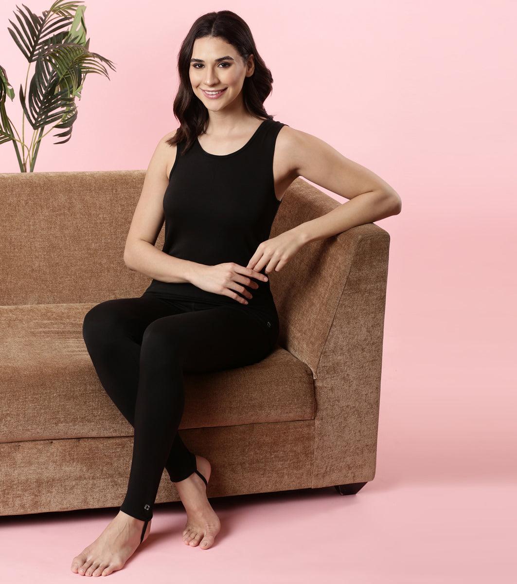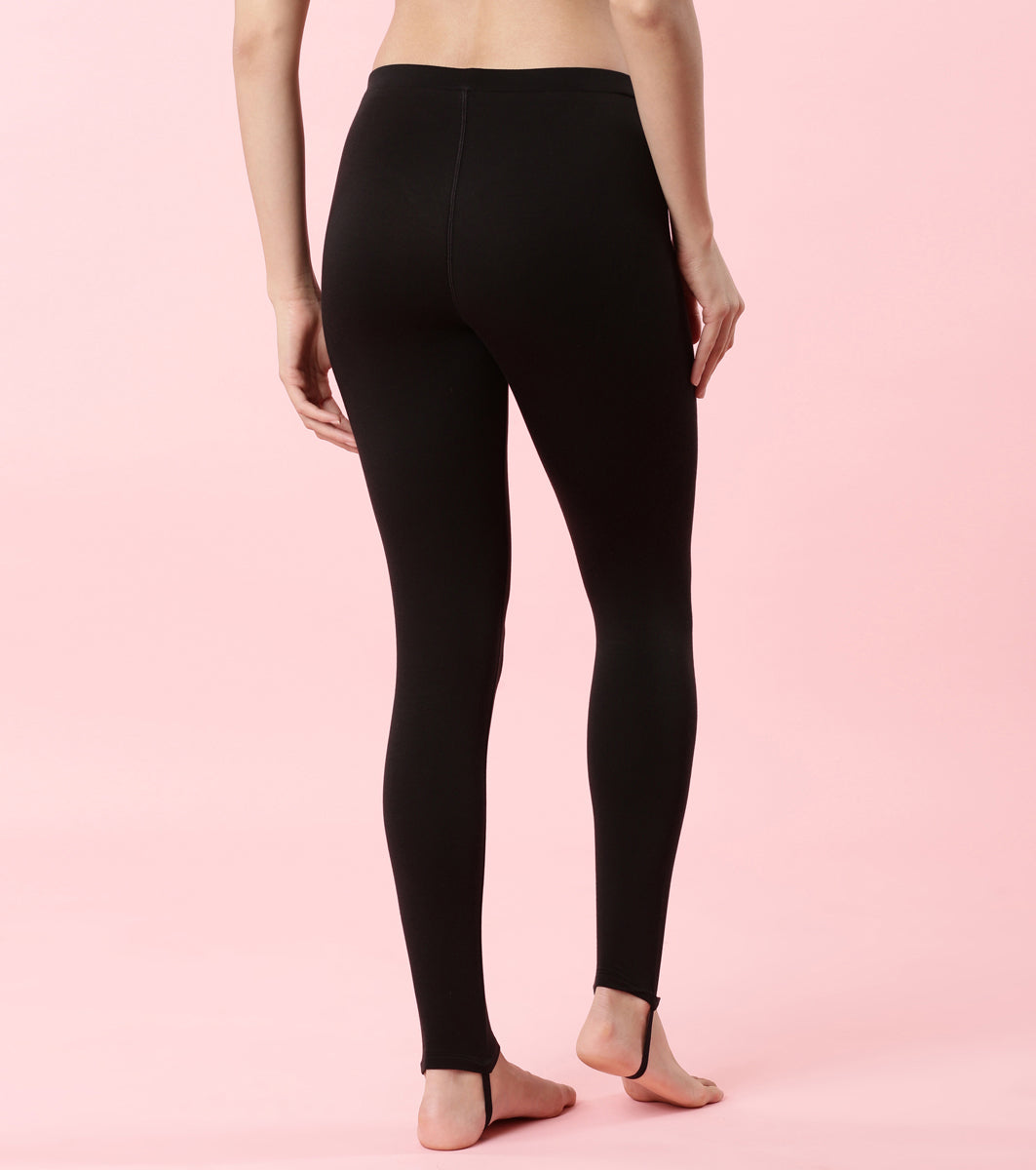 Enamor TH06 Women's Thermal Leggings with Soft Heat Generating Fabric, No Roll-Up with Stirrups at Bottom Hem, Engineered with HeatSkins™ Warm Technology. (Black)