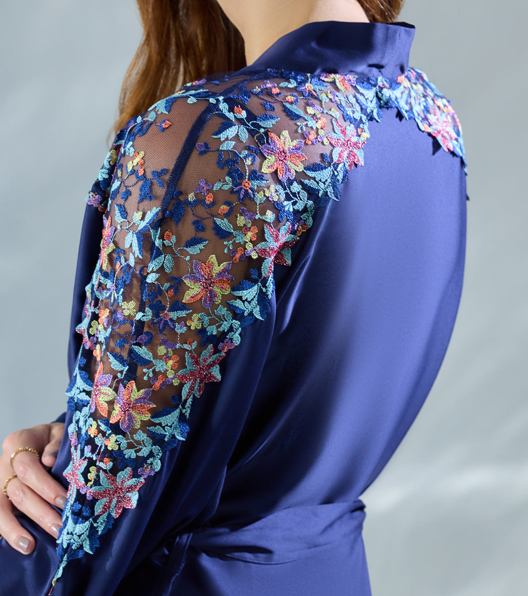 Layer over the Cosmic Crush lingerie set for a complete celestial ensemble or wear solo as a luxurious lounge or outerwear piece.