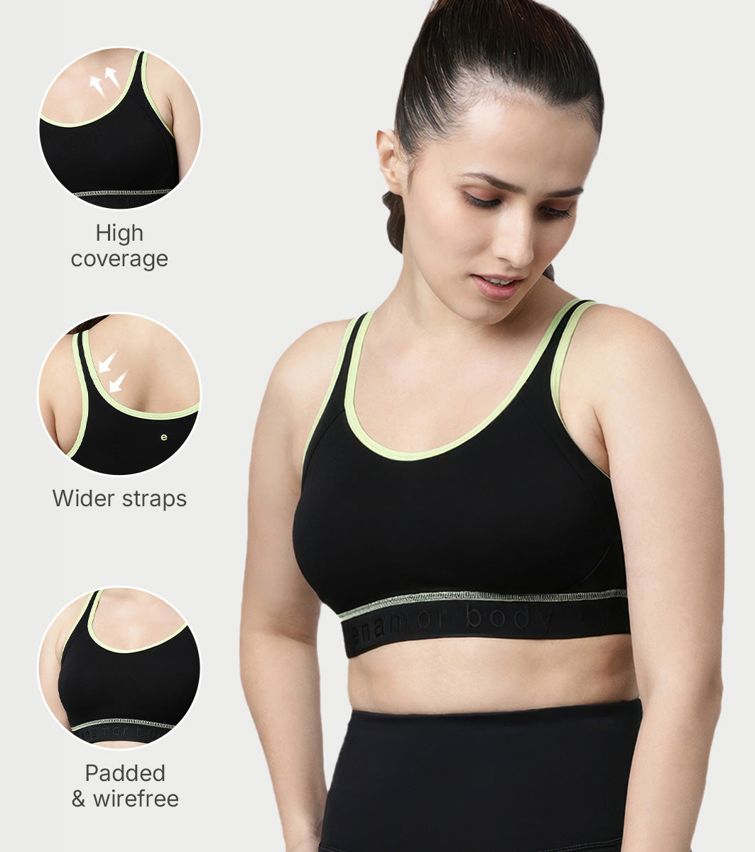 Enamor Innovations Antimicrobial, Side Shaper, Women's Cotton Medium Impact Sports Bra - Fixed cup, Padded, Wirefree, High Coverage - SB28 (Black)