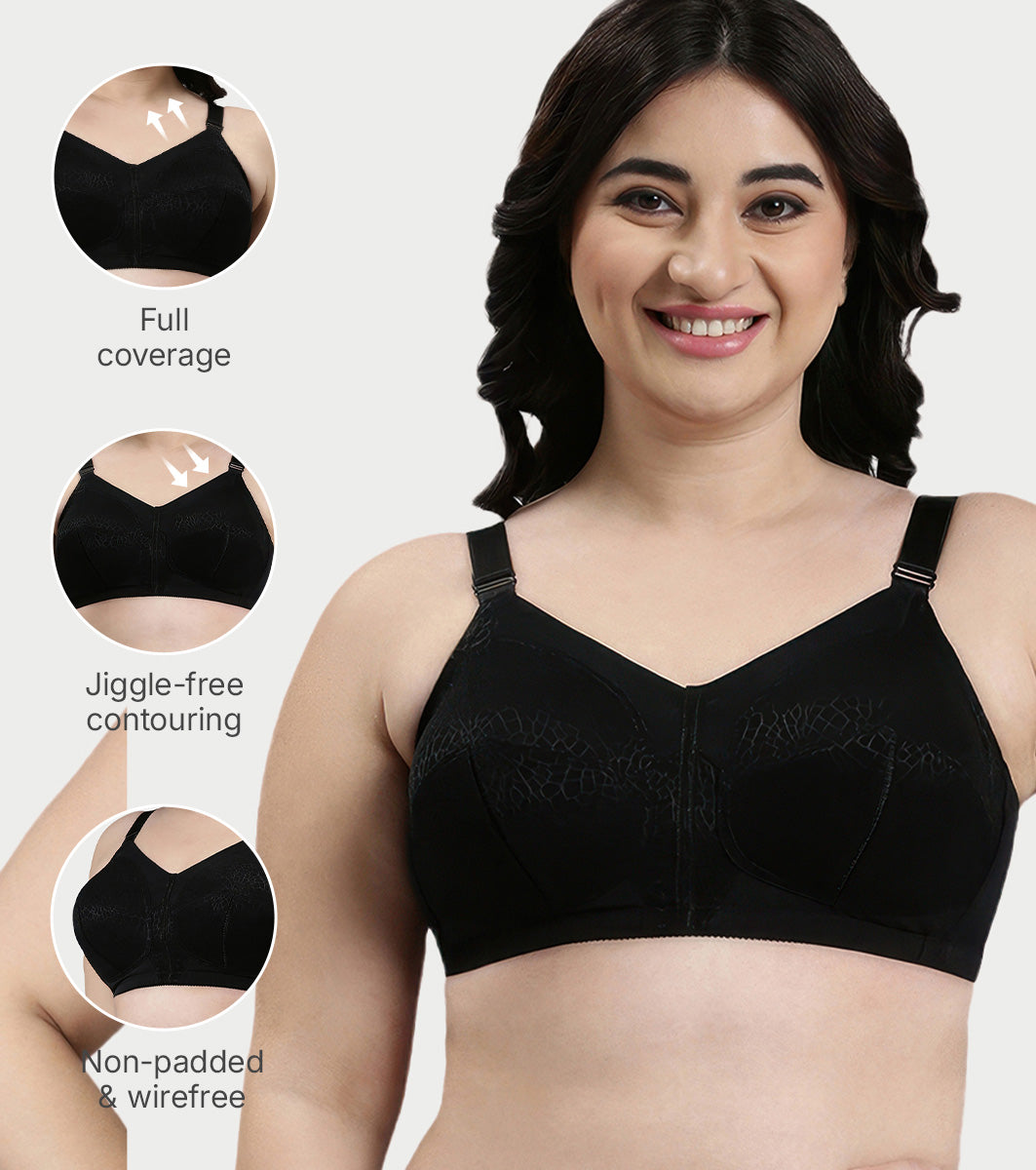 Enamor Innovations Transform M-Frame, Ultimate curve Support, Jiggle control, Women's Bra - Non Padded, Wirefree, Full Coverage - F096 (Available in Plus Sizes) (Black)